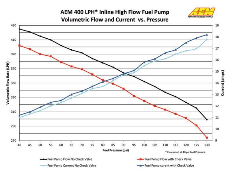 AEM’s 400LPH High Flow, High Pressure Fuel Pump is capable of supporting over 1,200 HP normally aspirated and a whopping 860 HP at 30 psi boost!* It flows 400LPH (100 gph) at 40 PSI, 340LPH (90 gph) at 73 PSI, and 270LPH (71 gph) at 120 PSI. Complete flow curves from 35 to 120 PSI and current draw vs. fuel pressure charts are available in the Specs tab.