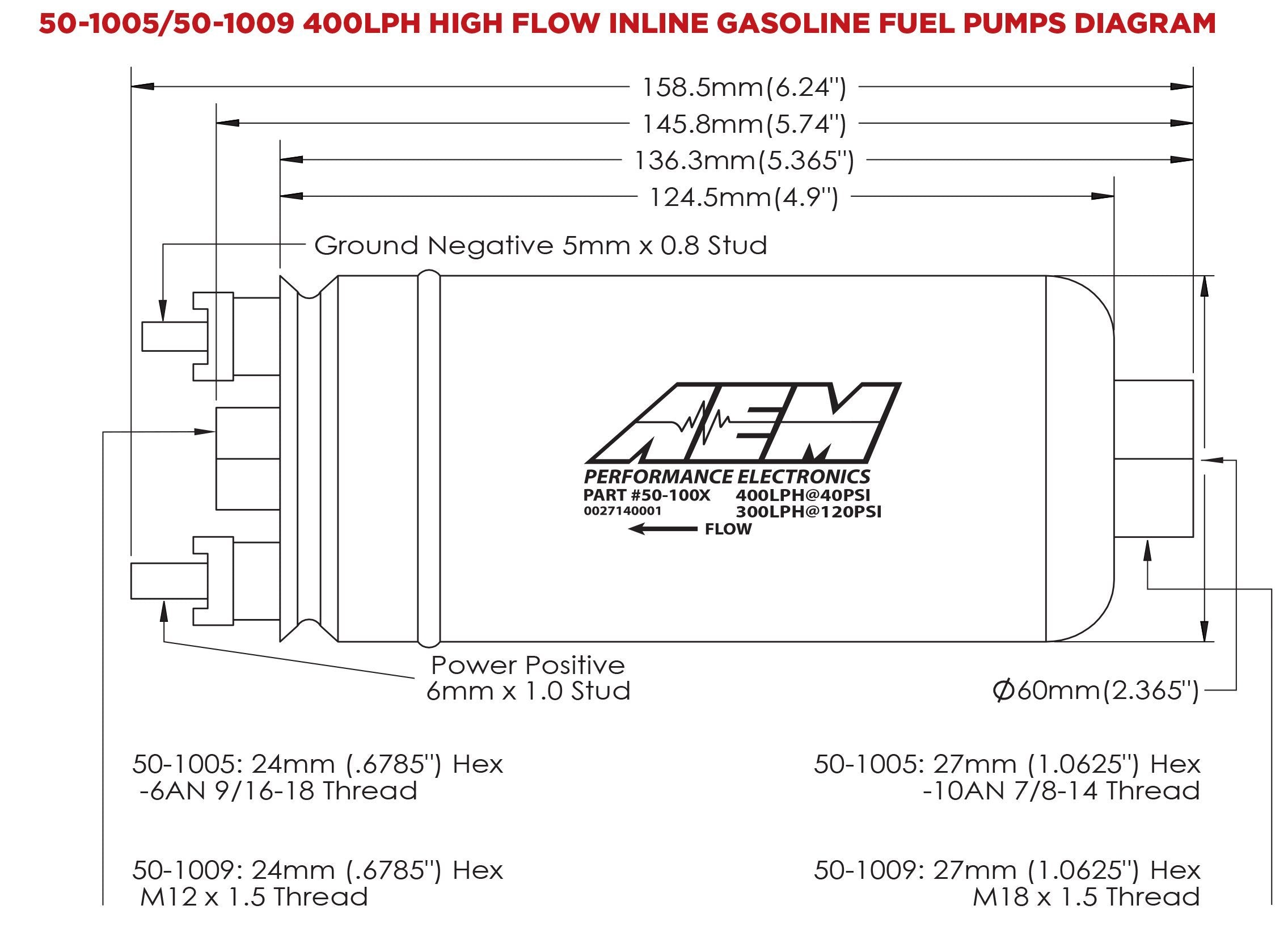 - Your vehicle’s factory fuel pump wiring may not be adequate enough to handle the current draw of AEM’s High Flow Fuel Pumps. Please refer to the Electrical Requirements section in the instructions document for proper wiring.