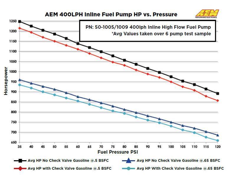 *Power rating given using gasoline and assuming a base fuel pressure of 43 PSI, 13.5v at the pump with a BSFC of 0.5. Boost fuel pressure is assumed to be the base pressure of 43 PSI + boost pressure. Flow capability for horsepower support is ultimately dependent on fuel hose diameter, and system electrical voltage and amperage capabilities.