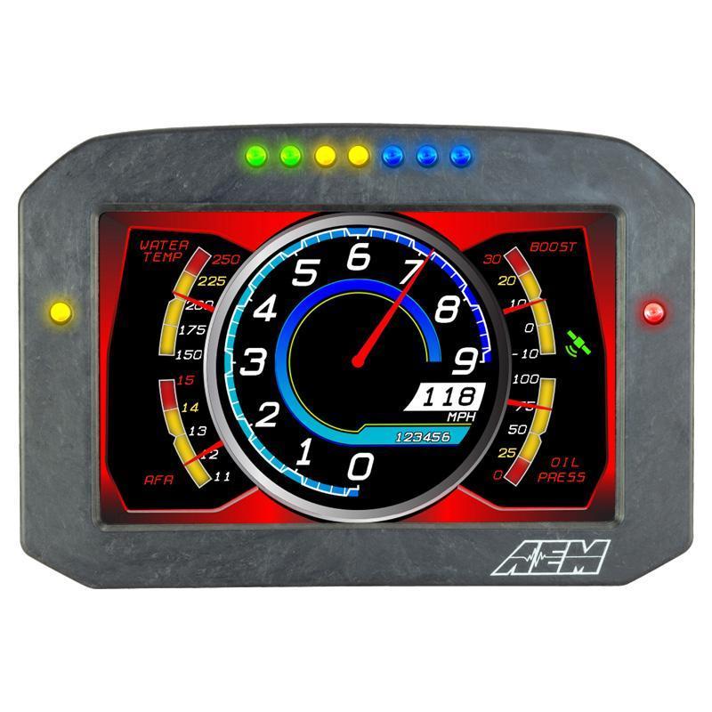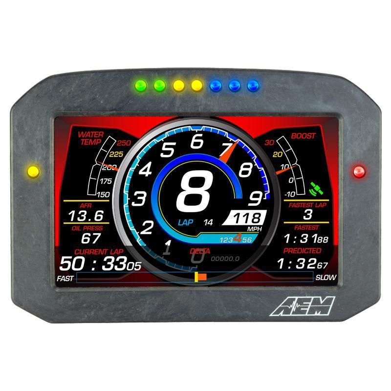 LOGGING, TRACK MAPPING, SPEEDO and ODO CAPABILITIES: CD Carbon Dashes receive channels from CAN bus inputs and do not require special modules to read AEM and/or non-AEM CAN signals. They communicate with 45 AEM devices, are in-house tested to work with 159 non-AEM devices and we have DBC CAN files for 52 more non-AEM devices.