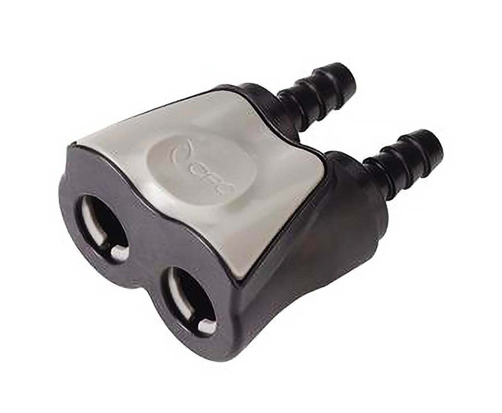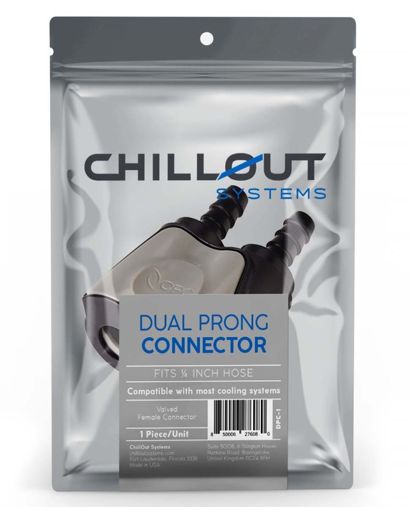 Dual-prong adapter connects Chillout cooling garments (or other brands cooling shirts with ¼” tubing) to a Chillout Systems driver cooling system with ¼” adapters.