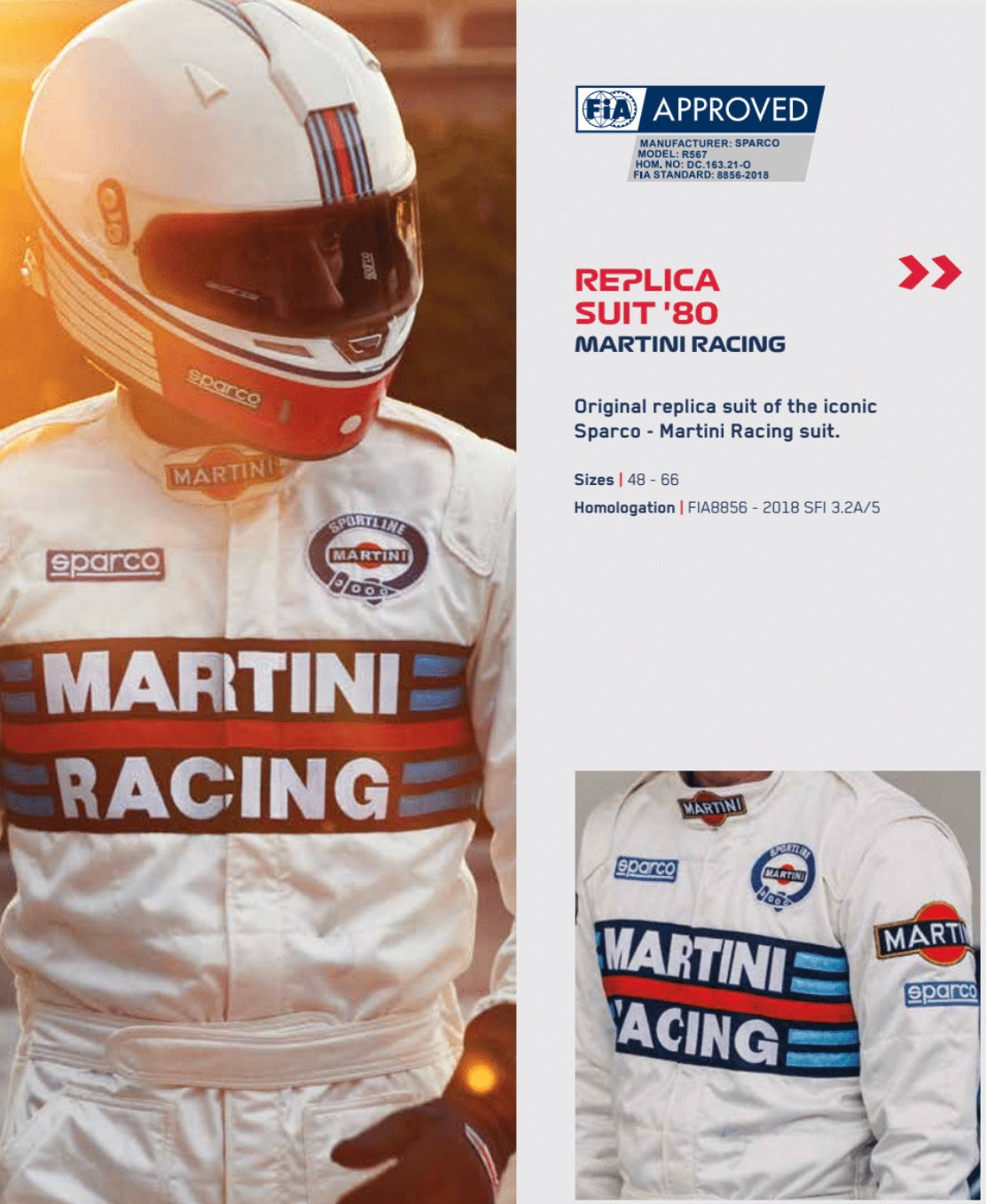 The Sparco Martini Racing Replica Race Suit is made with all-new lightweight three-layer fabric. It offers superior fire protection, breathability, and comfort when compared to the original worn back in the day. The suit features iconic Martini Racing embroideries and patches to faithfully recreate the original look. The Martini Racing replica race suit is made from Sparco's latest generation fabrics, offering a soft, lightweight outer fabric and breathable inserts at the sides, plus a large lower-back stretch panel for maximum comfort.