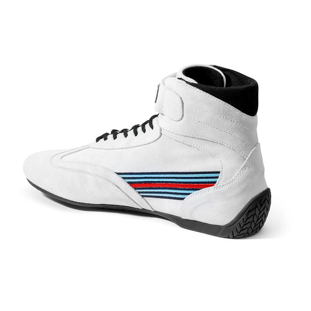 The Sparco Martini Racing Top shoe is made with high-quality suede and is embroidered with the classic Martini Racing stripes. It offers superior fire protection, breathability and comfort when compared to the original. The Martini Racing Top shoe features a wide Velcro strap for greater ankle support and guaranteed fit and hold. The outer sole is anti-static and oil/fuel resistant and utilizes anti-slip technology for greater pedal feel. A balance point on the heel improves driving sensitivity. Available in black, blue and white in sizes from EU37 to EU48. The Martini Racing Top is FIA 8856-2018 approved.