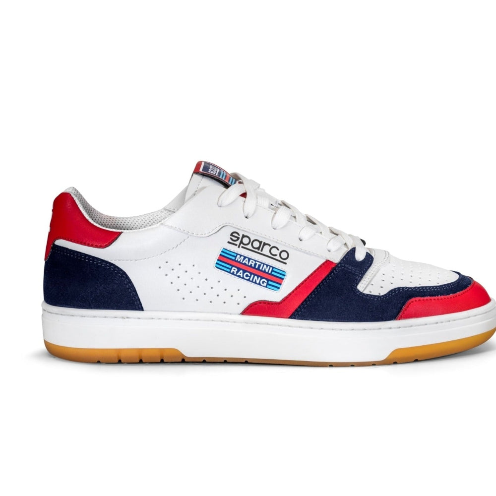 Lifestyle hero image of Sparco S-Urban Martini Racing shoes with 80s-style design, red-white-blue colorway, and amber rubber outsole
