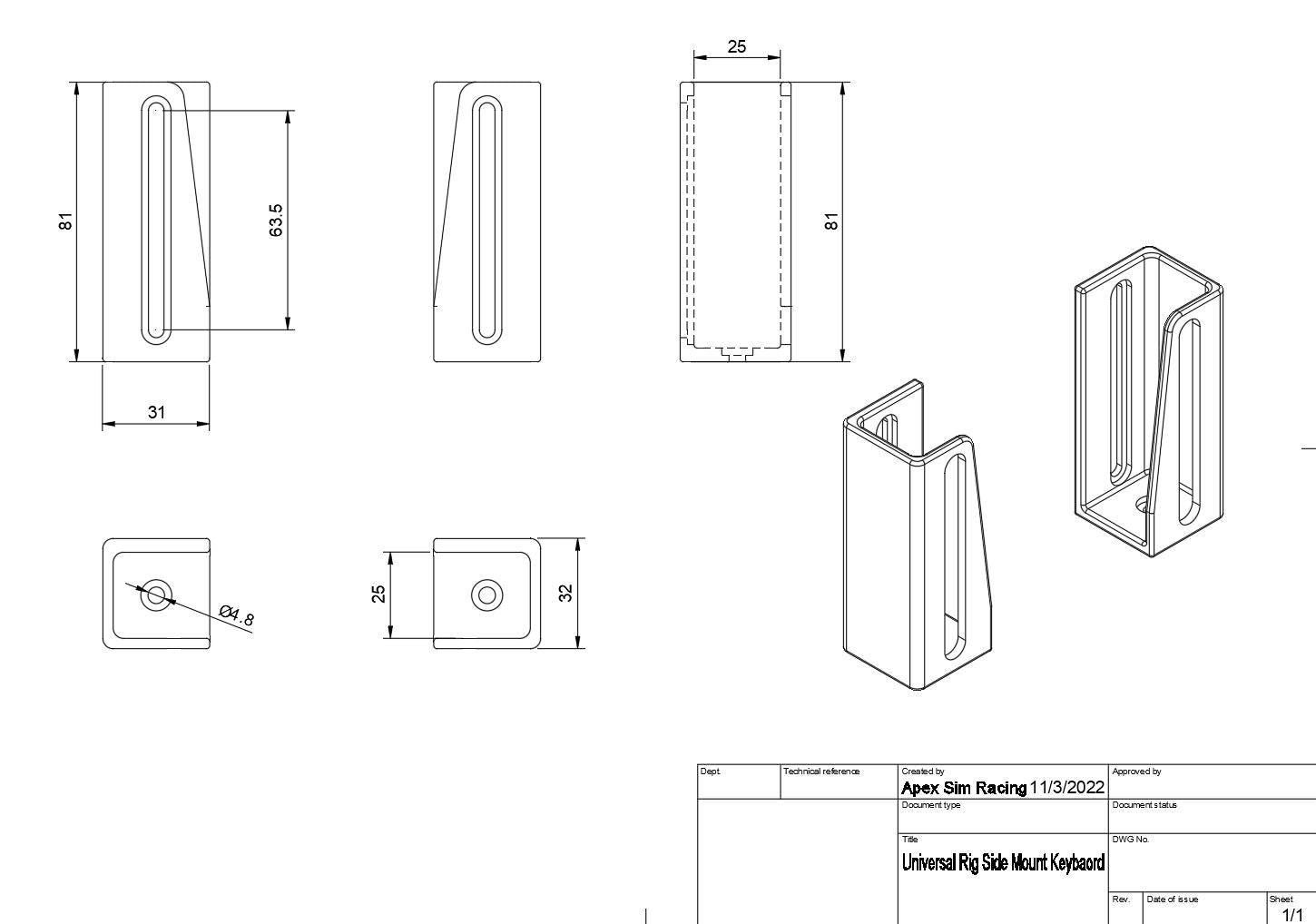 The Apex Sim Racing Universal Keyboard Rig Side Mount is a practical and sturdy solution for mounting your keyboard to your sim racing rig. Designed with convenience and durability in mind, this 3D-printed mount allows you to attach your keyboard to the side or top of your rig's extrusion, providing easy access and optimal positioning during your races.