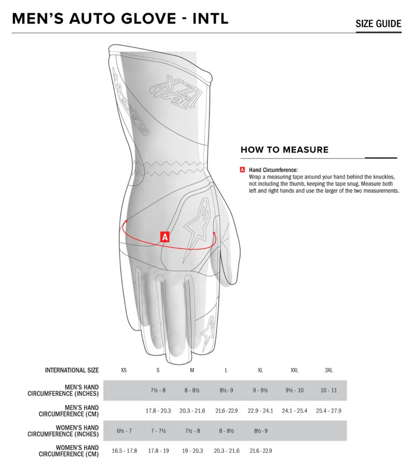 Alpinestars Tech-1 K Race v2 Pure Karting Glove Size Chart