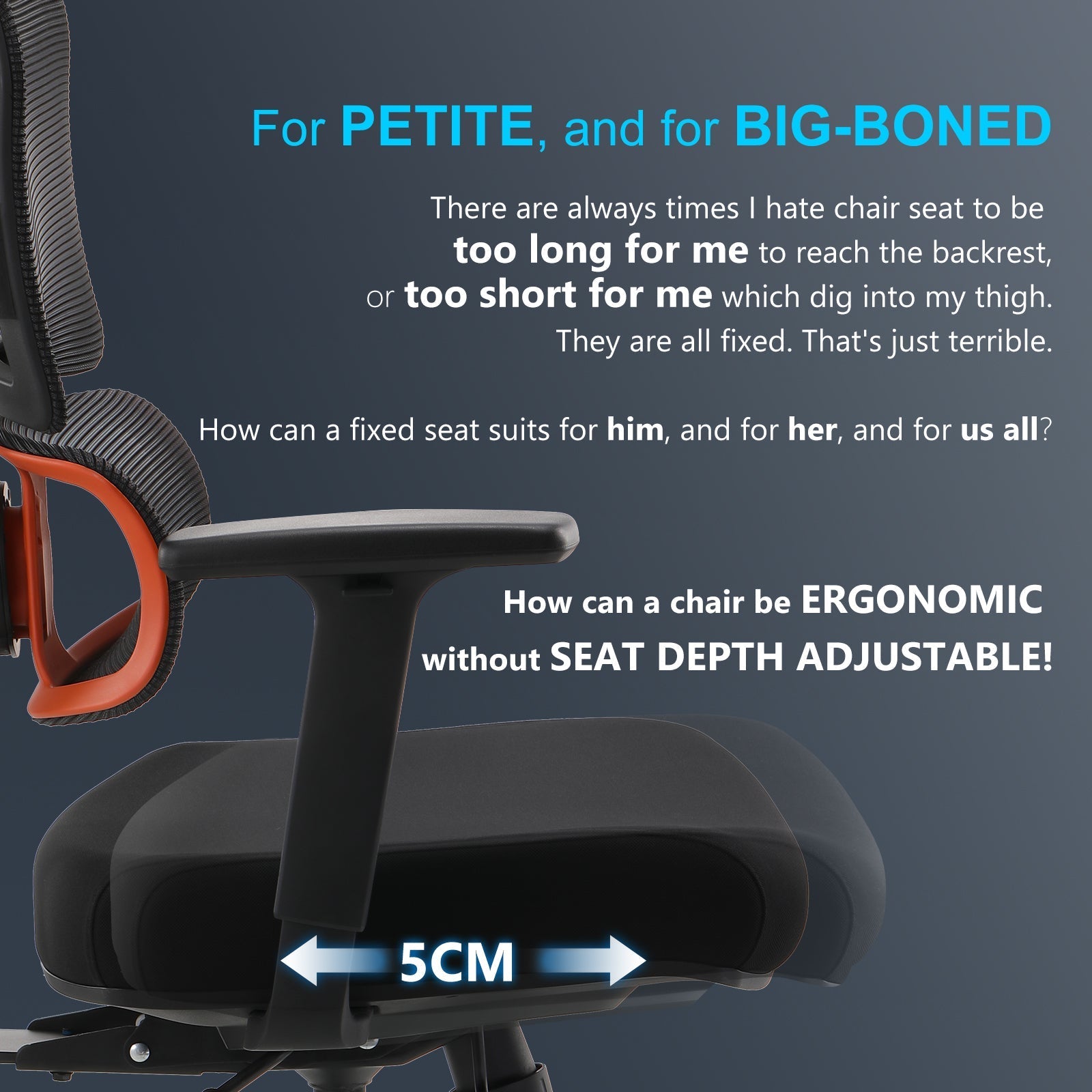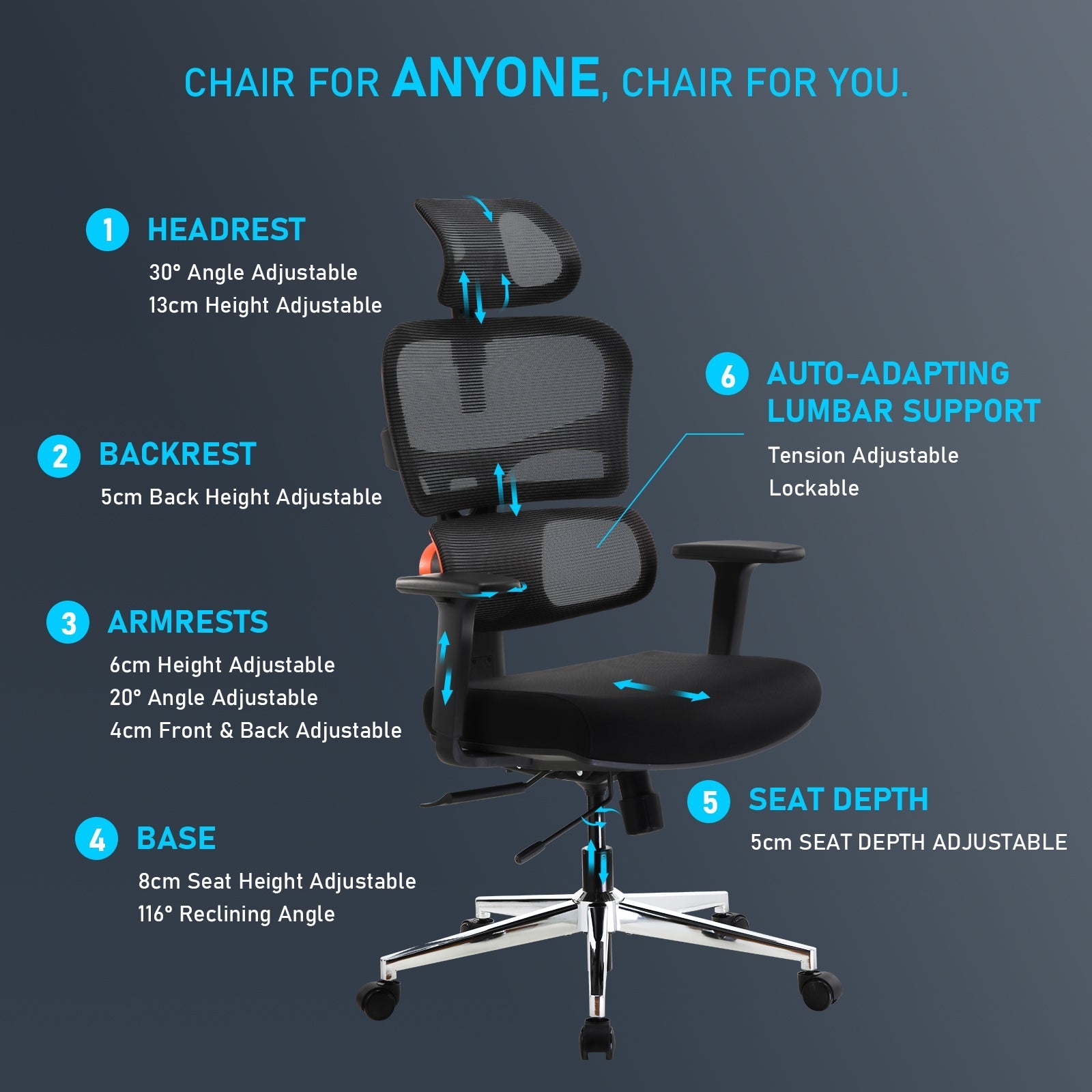 Adjust the sitting position with 5 locking positions and experience a new way of sitting like you never had before.