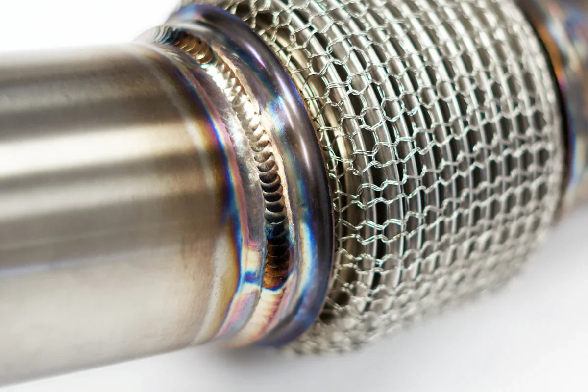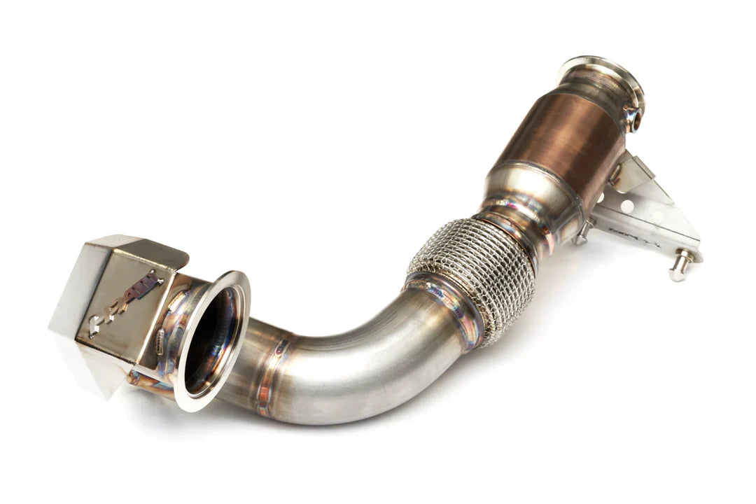 The average OEM 63mm downpipe diameter coupled with a restrictive catalytic converter and varying angles don't allow for ideal flow specifications and result in higher back pressure at the turbo forcing it to work harder and generate excessive heat.