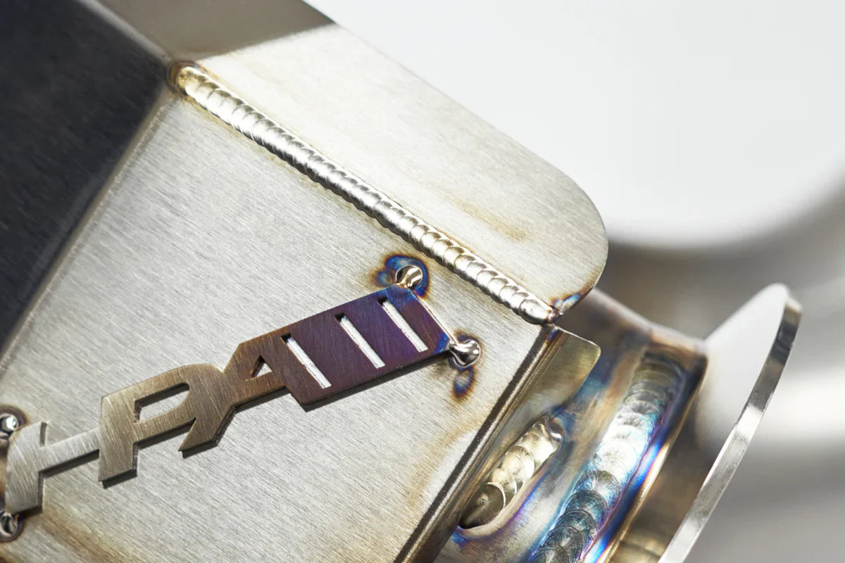 HPA’s resulting 3” downpipe is a fabrication assembly designed around functionality and durability and proudly manufactured in Canada. .063wall T304L stainless mandrel tubing is precision tig welded and Argon back purged for an ultra clean look on the exterior and a perfect clean weld on the interior. HPA's CNC formed hanger and laser cut flanges mate this assembly to the chassis and will withstand the thermal conditions the turbo will generate. The flex couplings feature an internal stainless steel interlock liner that facilitates smooth flow of high temperature exhaust gases.