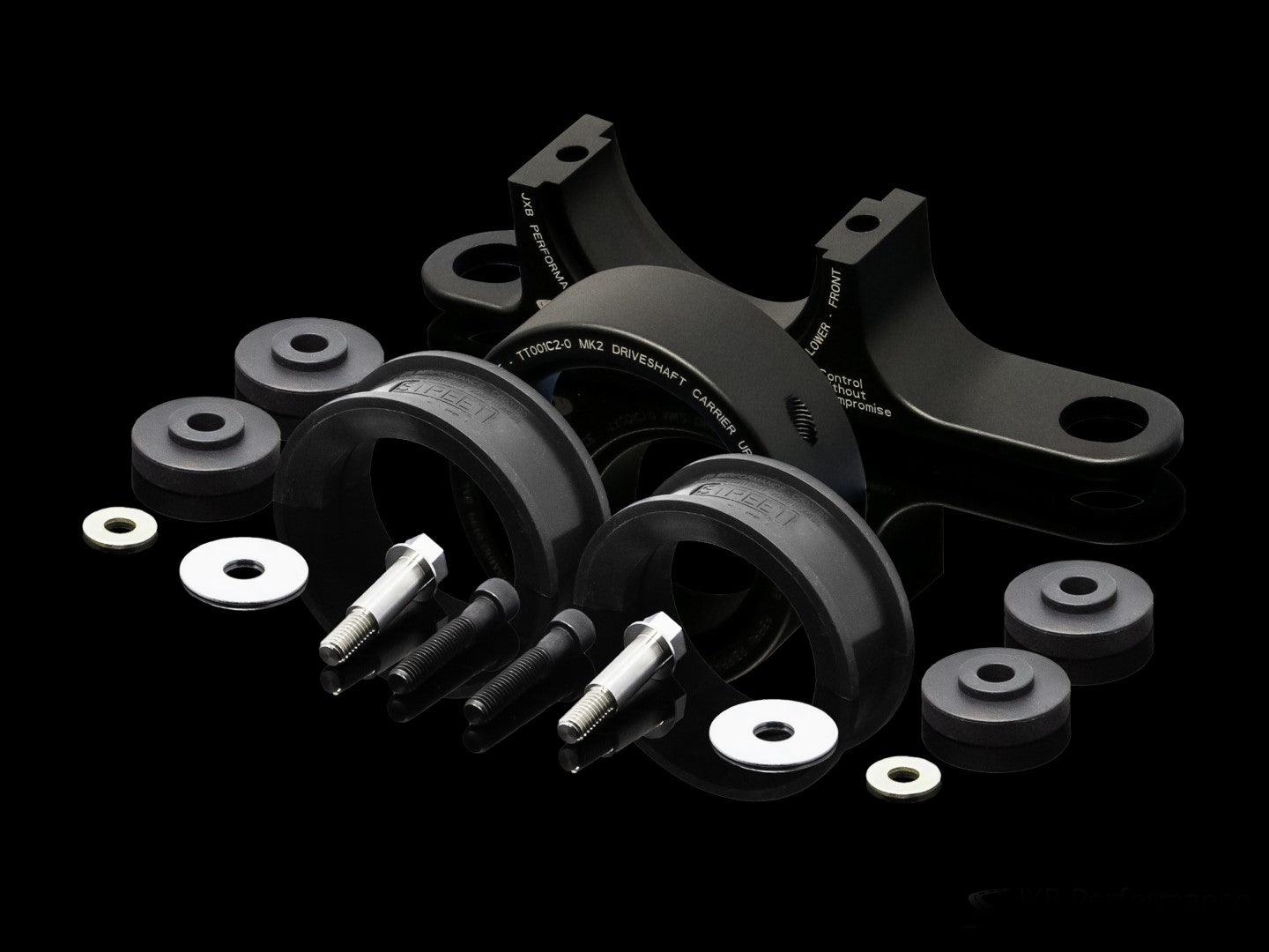 The stock center support bearing carrier is designed to reduce NVH to the cabin by loosely holding the center bearing with flimsy rubber spokes. During launches and shifts, the driveshaft is allowed to travel off-center, decreasing throttle response and causing oscillations through the drivetrain. As they age, the carrier rubber sags and dry rots, ruining the driveshaft alignment.