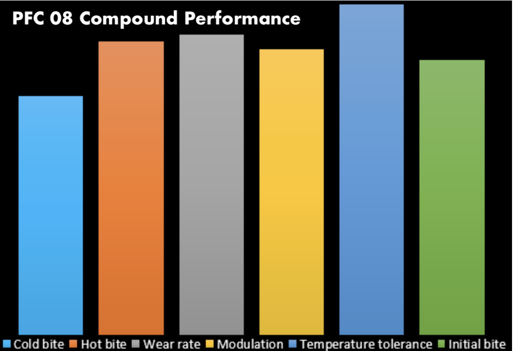 One of PFC's most popular compounds which came to fame in Endurance Sportscar and GT racing due to its performance in applications where smooth initial bite is a must. PFC08 has a slight friction rise with temperature, excellent release and modulation characteristics. Despite its considerable performance, 08 has the lowest wear rate of all PFC compounds and can easily match the wear characteristics of the other competitors' materials but with much higher bite and consistent performance across a broad temperature range.