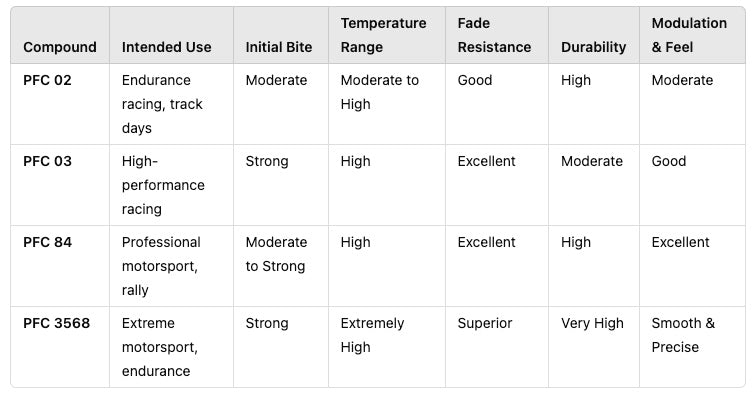 The 02 compound from PFC (Performance Friction Corporation) is a high-bite, high-friction brake pad designed primarily for sprint and high-downforce racing applications. It provides aggressive initial bite, excellent modulation, and consistent performance across various temperature ranges.