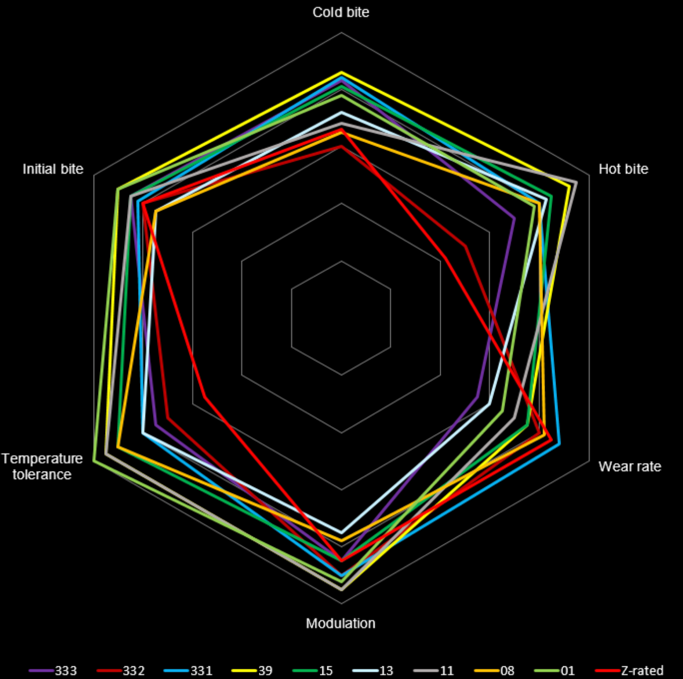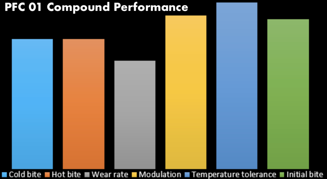 Ultra-smooth and great for tracks with high grip or high downforce cars. It is the ultimate combination of high bite and infinite control. Ideal where high bite in the first one-third of the stop is desired. PFC 13 exhibits wear on a par with PFC’s legendary 01 compound, but will operate at higher temperatures if called on.