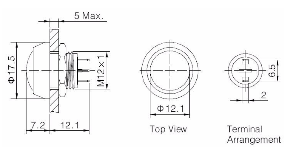 These Sim Racing 12mm momentary push buttons are front mounted and will fit up to a 4mm thick panel. Cut out hole size is 12.2mm and the button diameter is 17.5mm.